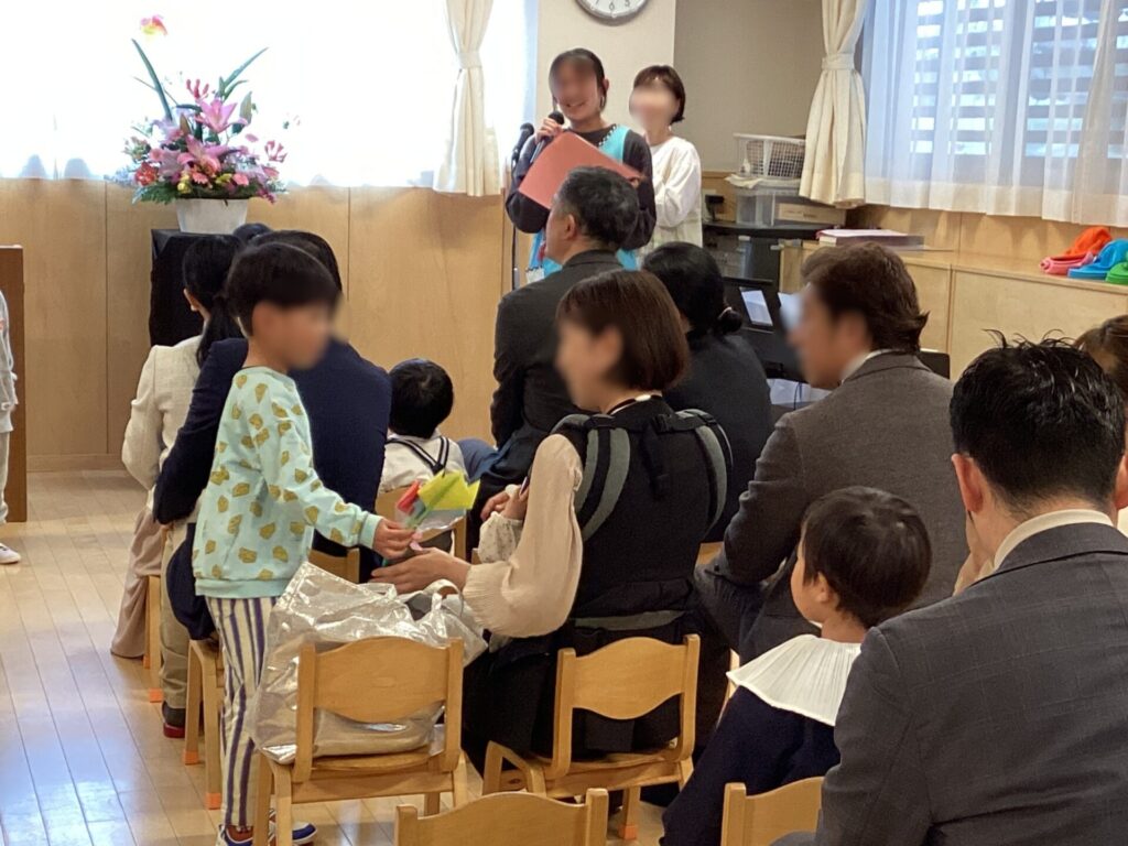 式の中では在園児を代表して、5歳児きりん組のお友だちから入園したお友だちに「にじ」の歌と折り紙で作ったチューリップの花束をプレゼント。